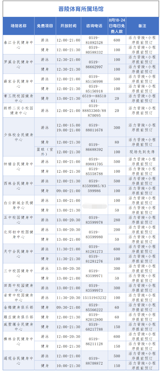 游泳、健身项目:8月17日起可在“活力晋陵+”小程序0元预订(提前72小时预订),每人每日单项目仅可订1张。8月18日-8月24日当天凭相应订票入场码核销后进馆游泳或健身;也可到馆现场登记后入场。