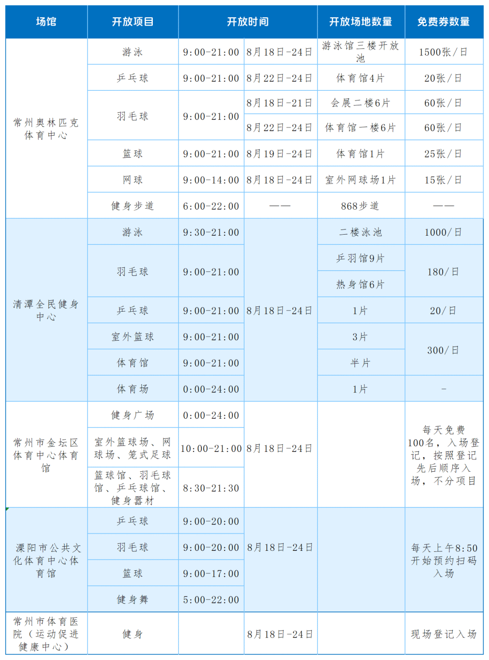 注:因8月18日-8月21日举办常州市第八届残疾人运动会,常州奥体中心面向公众免费开放时间和场地有所调整。
